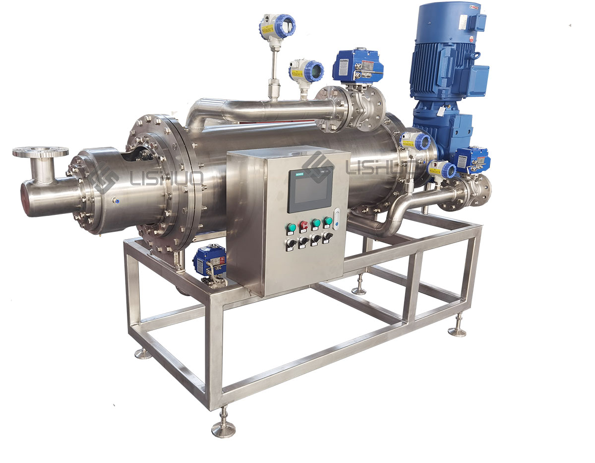 旋流換熱器可以用于多種工藝流程,在換熱器內部,傳動軸在換熱器內部旋轉,物料會通過軸和換熱管形成的通道,加熱或冷卻介質在夾套中流動。在運行過程中,旋轉換熱面連續不斷地攪拌旋轉運動增強換熱效果,同時攪拌產品使溫度更為均勻更準確,減少物料集聚和機械減載,這種設計可以減少管內產品的積聚,還可以平衡受力,防止軸發生彎曲。在占地面積有限的空間內,換熱器可以垂直安裝,可以對軸進行拆卸,便于檢查和維護。且帶有自動清洗功能,智能簡單易操作。